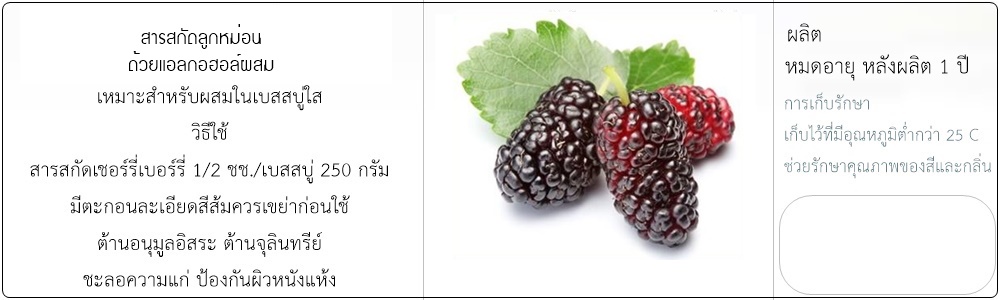 เหมาะสำหรับผสมในเบสสบู่ใส สครับ ครีม หรือ โลชั่น วิธีใช้ สารสกัด 1/4-1/2 ชช. ต่อเบสสบู่ หรือ สครับ 250 กรัม อาจมีตะกอนละเอียดควรเขย่าก่อนใช้ หม่อน ชื่อสามัญ mullberry มีสารต้านอนุมูลอิสระ ช่วยให้ผิวกระจ่างใส ชะลอความแก่ ป้องกันผิวหนังแห้ง เขย่าขวดก่อนใช้ เก็บไว้ในที่ต่ำกว่าอุณหภูมิ 25 C สีและกลิ่นจะคงเดิม