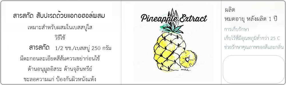 มีวิตามิน C บำรุงผิวพรรณให้เปล่งปลั่งสดใส ต่อต้านอนุมูลอิสระในร่างกาย ช่วยชะลอการเกิดริ้วรอย เอนไซม์ Bromelainช่วยยับยั้งการอักเสบลบรอยแผล สารสกัดสัปประรดด้วยแอกอฮอล์ผสม เหมาะสำหรับ ใช้ผลิตสบู่สมุนไพร สครับ ครีม หรือ โลชั่น ![]() ![]() |