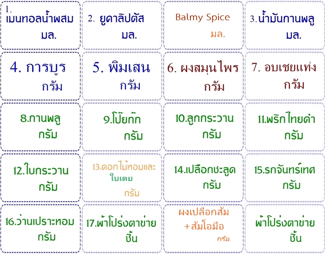 อบเชย การบูร พิมเสน เมนทอล และอื่นๆ มาผสมกันแล้วหมักด้วยน้ำมันหอมระเหย
