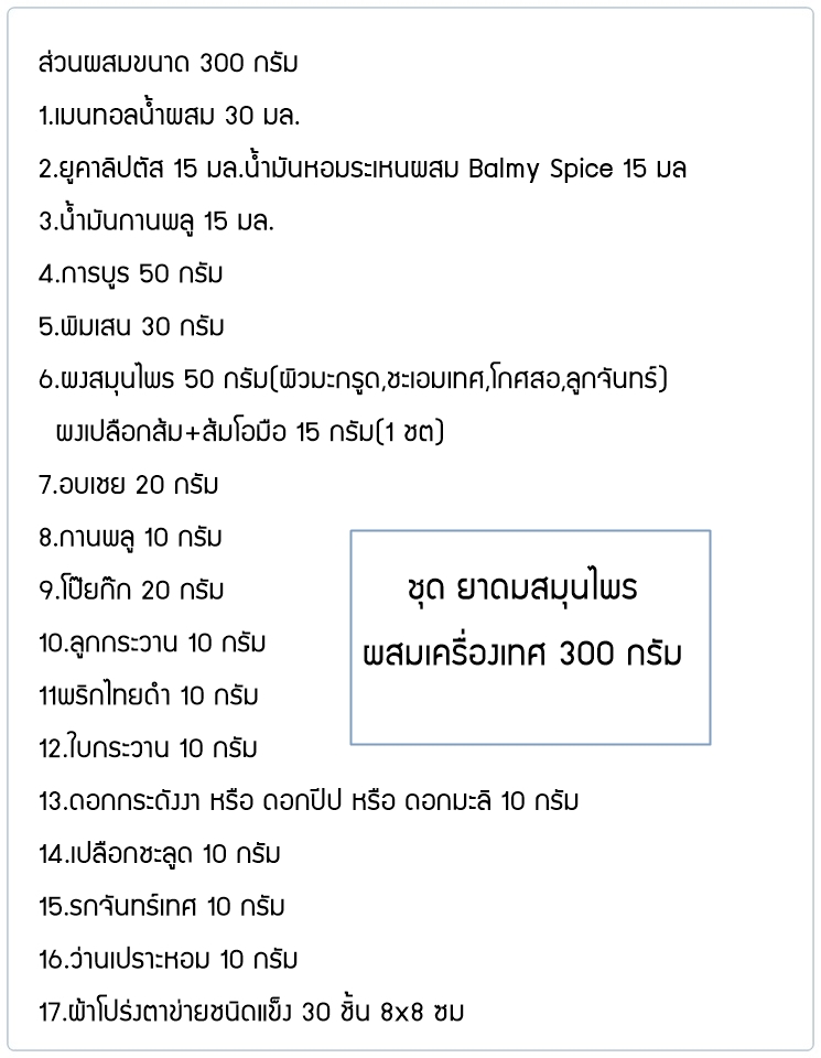 เช่น ลูกจันทน์ ดอกจันทน์ กานพลู เปลือกชะลูด ดอกกุหลาบอบแห้ง(สีชมพู-น้ำตาลอ่อนๆ)