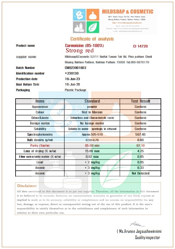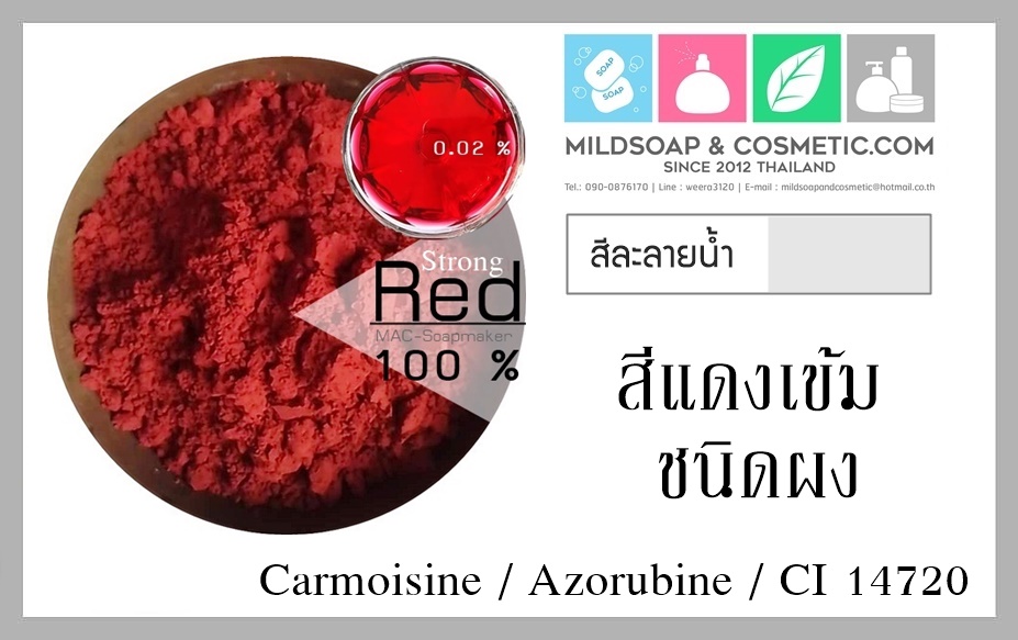 วิธีใช้ : ละลายในน้ำอุณหภูมิห้อง ก่อนผสมผลิตภัณฑ์ E-number : E C. I. No. : 14720 Alternative Names : Carmoisine ,Azorubine ,Food red 3 Purity : 100 % (ไม่น้อยกว่า 85 %) คุณสมบัติ ผงสีแดง 0.1% ของสารละลายในน้ำมีสีแดงเข้ม ไม่มีกลิ่น ละลายได้ในน้ำได้ 14.0 % กลีเซอรอล และโพรพิลีนไกลคอล 10.0 % ![]() ![]() ![]() ![]() ![]() |