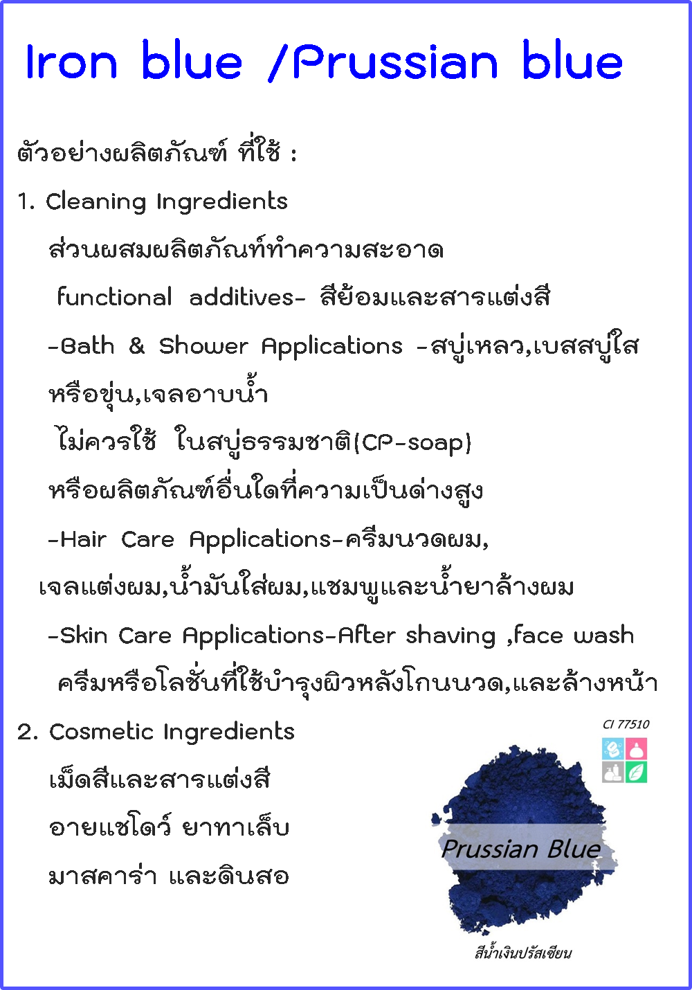 การเตรียม:มีความคงทนต่อ ความร้อน และไม่ซีดจางง่าย การใช้: สี ใช้กับเครื่องสำอางประเภทที่1 ใช้ได้กับเครื่องสำอางทุกชนิด***ไม่มี Cyanide ion ปนเปื้อน ปริมาณที่แนะนำ: สีมีความเข้มของสีสูงมาก ใช้ปริมาณน้อย 0.1-2.5 % ควรผสมสีลงในน้ำมันพืช น้ำมันแก้ว (อัตราส่วน สี 1 ส่วน / น้ำมัน 2 ส่วน ) เพื่อให้ผงสีกระจายตัว แล้วนำไปผสมหรือค่อยๆหยด ลงในผลิตภัณฑ์ที่ต้องการ ตัวอย่างผลิตภัณฑ์ ที่ใช้ : 1. Cleaning Ingredients ส่วนผสมผลิตภัณท์ทำความสะอาด functional additives- สีย้อมและสารแต่งสี -Bath & Shower Applications -สบู่เหลว,เบสสบู่ใส หรือขุ่น,เจลอาบน้ำ ไม่ควรใช้ ในสบู่ธรรมชาติ(CP-soap)หรือผลิตภัณฑ์อื่นใดที่ความเป็นด่างสูง -Hair Care Applications-ครีมนวดผม,เจลแต่งผม,น้ำมันใส่ผม,แชมพูและน้ำยาล้างผม -Skin Care Applications-After shaving ,face wash ครีมหรือโลชั่นที่ใช้บำรุงผิวหลังโกนนวด,และล้างหน้า 2. Cosmetic Ingredients เม็ดสีและสารแต่งสี อายแชโดว์ ยาทาเล็บ มาสคาร่า และดินสอ